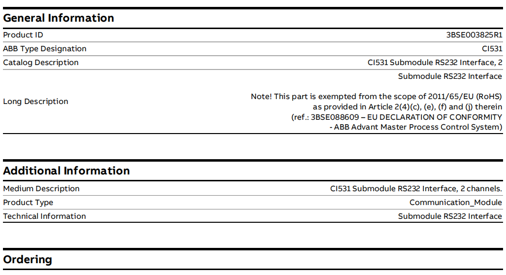 CI531 هو مكون تمديد اتصال تسلسلي مخصص في نظام التحكم في العمليات الموزعة ABB Advant Master. يتم تعريف 3BSE003825R1 على أنها واجهة الوحدة الفرعية RS232، وقناتان. وتتمثل الوظيفة الأساسية في توفير منفذي اتصال تسلسليين غير متزامنين مستقلين يتوافقان مع معيار EIA-232 لوحدات التحكم من سلسلة Advant Controller 410/450.