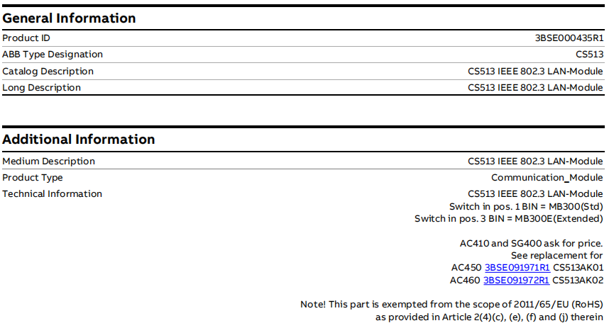 يعد CS513 مكونًا رئيسيًا لاتصالات الشبكة في نظام التحكم في العمليات الموزعة ABB Advant Master. يتم تعريف 3BSE000435R1 على أنها وحدة IEEE 802.3 LAN. وتتمثل وظيفتها الأساسية في توفير واجهة اتصال Ethernet قياسية لوحدات التحكم من سلسلة Advant Controller 410/450، مما يتيح لهم الوصول إلى شبكات المنطقة المحلية على مستوى المصنع استنادًا إلى بروتوكول IEEE 802.3.