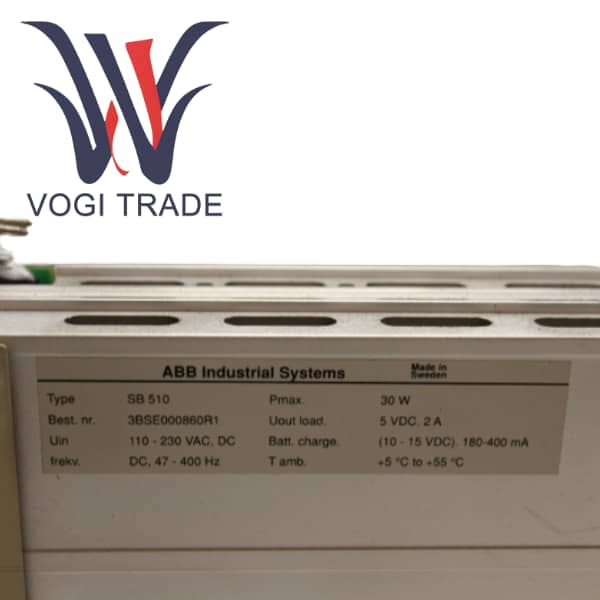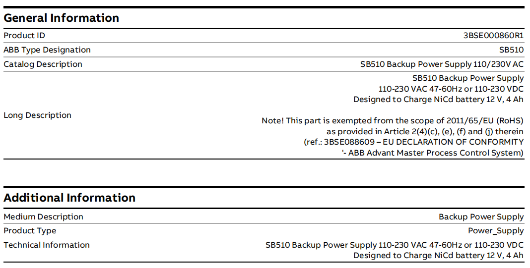 يعد SB510 أحد مكونات الطاقة الاحتياطية الرئيسية في نظام التحكم في العمليات الموزعة ABB Advant Master. يتم تعريف 3BSE000860R1 على أنه مصدر طاقة احتياطي. وتتمثل الوظيفة الأساسية في توفير مصدر طاقة تيار مستمر قصير ولكنه بالغ الأهمية للذاكرة الهامة في نظام Advant Master عند فشل مصدر طاقة التيار المتردد الرئيسي أو انقطاعه، وذلك لمنع فقدان البرنامج والبيانات الهامة الناجمة عن انقطاع التيار الكهربائي المفاجئ.