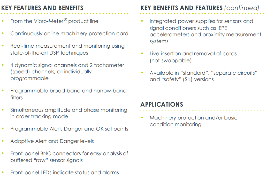 هذا الإصدار "القياسي" من MPC4 عبارة عن بطاقة متعددة الوظائف تعمل بكامل طاقتها وقادرة على معالجة إشارات الاهتزاز/الإزاحة الديناميكية من أربع قنوات وإشارات سرعة الدوران (السرعة) من قناتين في وقت واحد. يوفر تصميم MPC4 200-510-070-112 حماية موثوقة للماكينة، مما يمنع الأضرار المحتملة الناجمة عن الاهتزاز الزائد أو الإزاحة أو السرعة.
